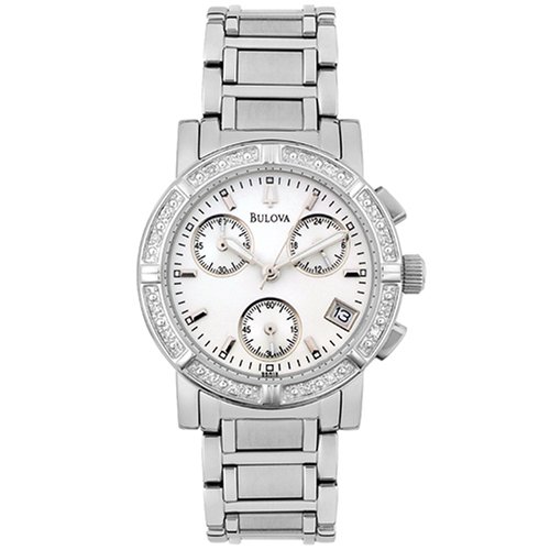 Sixteen diamonds frame a white pearlized dial in this elegant dress chronograph from Bulova. The perfectly round dial features luminous hands and markers, a stainless steel seconds hand, and a date window at the four o'clock hour. Three subdials display small seconds, minutes to sixty, and 24-hour time. This watch is set in a stainless steel case and presents on an attractive steel link bracelet that fastens with a deployment-clasp. This Bulova watch offers precise Japanese quartz movement and is rated water resistant to 30 meters.