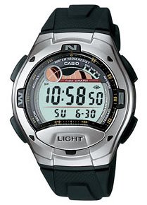 Digital quartz movement, Casual sports watch, Auto LED light with afterglow, Dual time, Simultaneous display of the current time in two different time zones, 1/100 second stopwatch, Countdown timer, Auto-repeat function, 4 daily alarms and 1 snooze alarm, Hourly time signal, Tide graph, Moon phase data, Auto-calendar, 12/24 hour formats, Stainless steel caseback, Black polyurethane selector buttons, Black directional letters embossed on brushed aluminum case (polished edges), 100 meters/330 feet water resistant