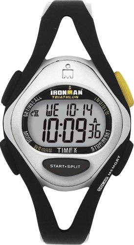 Timex gives its signature Ironman Triathlon multi-function, performance sport watch a sleek new look that's a great fit for both men and women. Featuring a full complement of athletic timing features and a striking profile, the Timex Triathlon Sleek T59201 has a metallic silver resin case that's complemented by a uniquely styled, slim profile black resin strap. It features three alarms that can be set for daily/weekday/weekend/weekly alarms, two time zones, an all-day white reflector display for easy reading even in direct sunlight, and water resistance to 100 meters. Sport timing functions include: