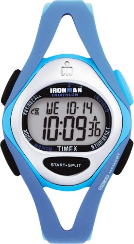 Timex gives its signature Ironman Triathlon multi-function, performance sport watch a sleek new look that's a great fit for both men and women. Featuring a full complement of athletic timing features and a striking profile, the Timex Triathlon Sleek T5B721 has a metallic silver resin case that's complemented by a uniquely styled, slim profile periwinkle resin strap. It features three alarms that can be set for daily/weekday/weekend/weekly alarms, two time zones, an all-day white reflector display for easy reading even in direct sunlight, and water resistance to 100 meters