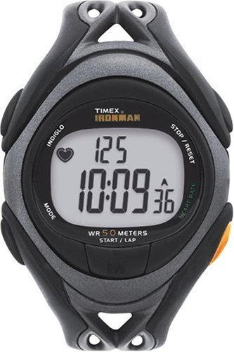 Combining stylish looks with power sport timing and heart rate monitoring features, this larger Timex Ironman Triathlon watch (model T5C401) can be worn by both men and women. It features a chest strap heart rate monitor, easily accessible function buttons, and Timex's comfortable doubleshot polyurethane strap. For integrating heart rate monitoring into your training, this watch enables you to track your avareage heart rate and pre-set target heart rate zones with data for time spent within that zone and alarms. It can also display data for calories burned and offers a recovery timer that measures your heart rate after a timed recovery during or after your workout. Sport timing features include: