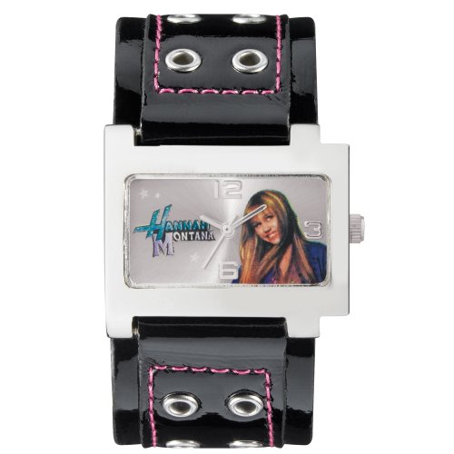 Disney presents this Hannah Montana watch on a black patent leather band accented with silver grommets and pink stitching. The square dial features Hannah Montana's face against a silver background with silver hands and Arabic numerals in the three, six, and 12 o'clock positions, within a 40-millimeter silver-tone case and framed by a stainless steel bezel. The watch is powered by an analog-quartz movement.