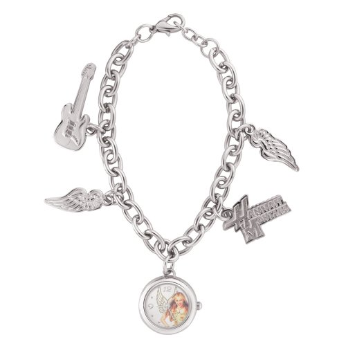 This Disney Hannah Montana watch presents on a charm-style bracelet that features four silver-tone charms in addition to the centrally suspended watch. The watch fastens with a lobster clasp. A silver dial marks time with silver-tone hands in a combination of Arabic numerals and silver dot indexes on one side, and Hannah's image on the other. The dial is housed within a 24-millimeter stainless steel case and is framed by a stationary bezel. This analog-powered timepiece is sure to be a hit with the Hannah fan in your family.