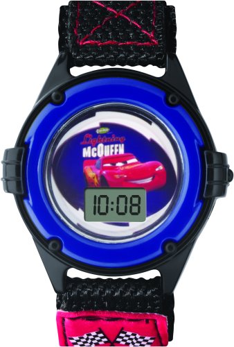 Keep track of time like the best race car drivers. Based on the hit Disney film, "Cars," this children's watch sports the image of the rookie race car and star of the film, Lightning McQueen. Made for boys and girls, this plastic watch has a sturdy black case, bright blue bezel, and a watch face with an easy-to-ready digital dial. The unique red and black canvas band connects with a fast-wrap clasp.
