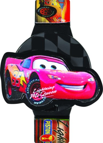 Lightning McQueen and graphics from the smash Disney film, "Cars," make this flip-top watch fun for kids. On this unique watch design, rookie race car McQueen lifts up to reveal a digital dial. Made for boys and girls, this plastic watch sports black and gray racing stripes on its case and bezel. The band with buckle clasp is brightly colored and decorated with images from the film.