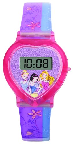 With the Disney Princess Trio kid's watch, you'll be the fairest of them all. The perfect first watch for young girls, this plastic watch displays the time on an easy-to-read digital dial. The clear pink case and bezel make a heart shape, framing a lavender watch face with the princess trio: Snow White, Cinderella, and Sleeping Beauty. The blue and lavender band features pretty pink flowers.