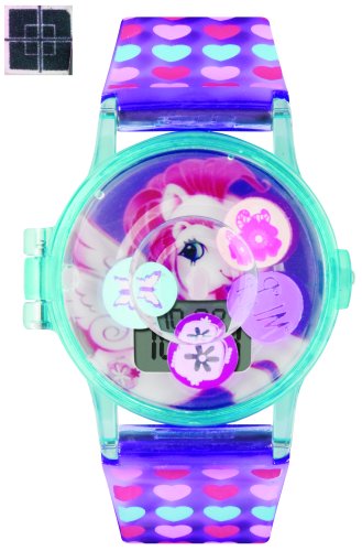 The 80s are back in style with this fun My Little Pony kid's watch. The perfect first watch for little girls, a digital dial at the bottom of the watch face makes reading the time easy. This plastic translucent watch features bright colors, including a teal bubble dome case and three interchangeable dials with purple, pink, red, and blue My Little Pony pictures and floating icons. With matching colors, the plastic band has a cute heart-shaped design.