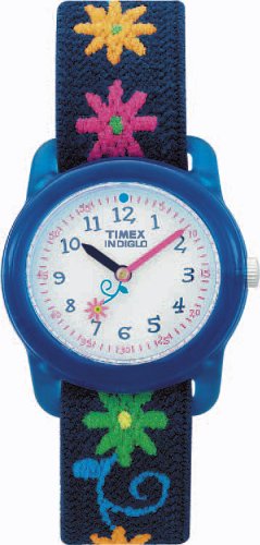 This is a cute girls watch. I am glad I bought 3 for xmas gifts to seven year old girls. It glows in the dark. The band was elastic cloth and easy to wear on and take off. The small numbers around the circumference show the minutes, was a nice touch for kids learning to read the time.